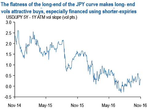 As a general rule, 11.0 has served as strong support for USDJPY 5Y vols this year which are best bought at or below that level, and carry efficiently so by financing the purchase by selling 1Y2Y vol in the calendar spread structures.