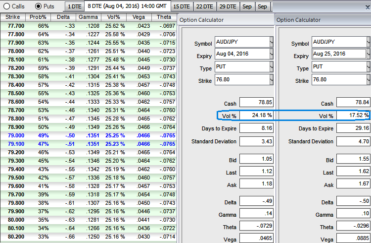 As we expect the underlying currency exchange rate of AUDJPY to make a larger move on the downside. As shown in the figure purchase 1M 2 lots of At-The-Money -0.52 delta puts and sell 1W one lot of (1%) In-The-Money put option.