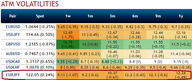 The EUR/JPY volatility surface is offering very attractive opportunities because the skew on the 6m and 1y is currently excessive (refer 4th graph). Where IV skews seem to be mispricing, which is why implied vols of this pair across the various tenors are reducing considerably.