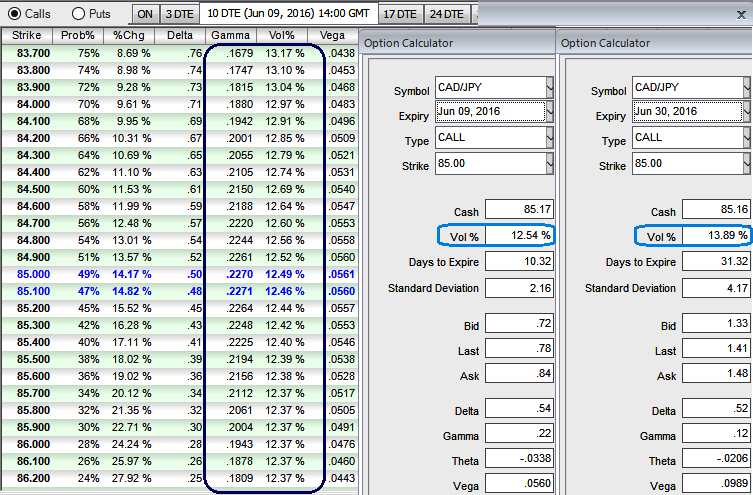 The implied volatility of 10D CADJPY ATM contracts 12.54% and creeping up at 13.89% for 1m tenors.