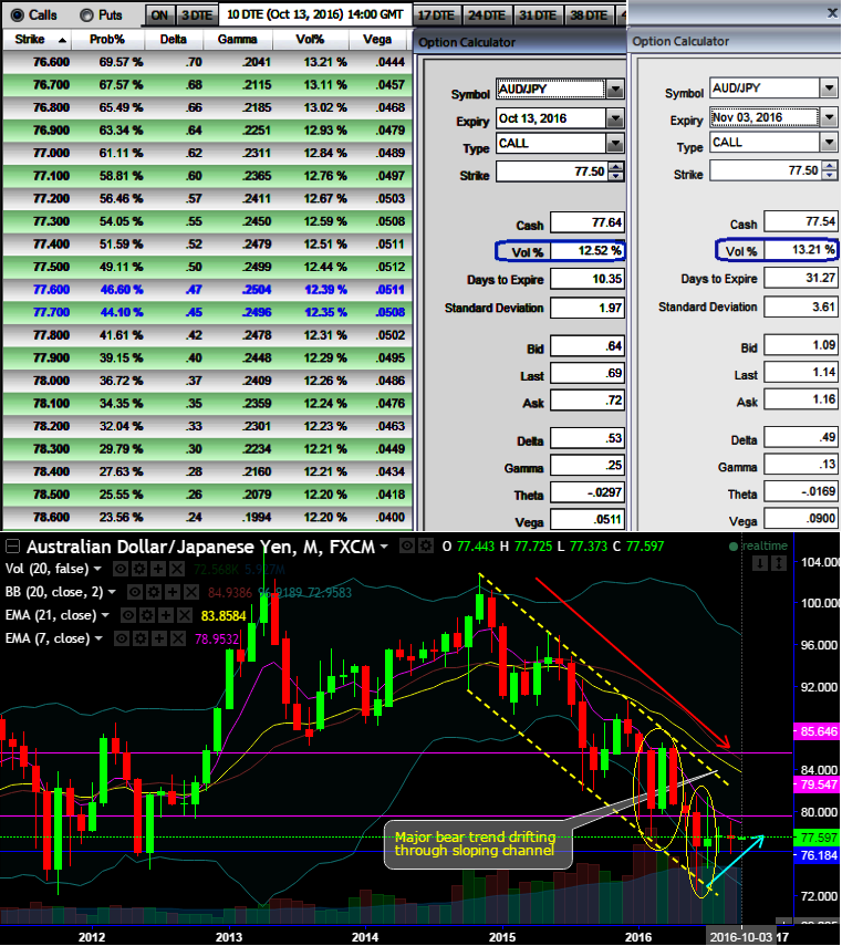 ATM IVs of AUDJPY is rising a shy above 12.5% as shown in the diagram the standard deviation these call option is flashing up at 1.97. While IVs of ATM contracts of 1m tenors are spiking crazily at 13.21%, this has been justified by historical volatilities in spot FX fluctuations (see big real body candles on monthly technical charts).