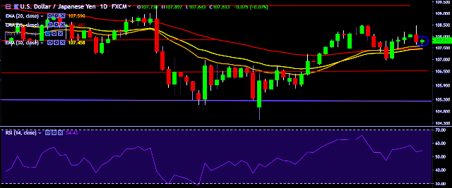 - It made intraday high at 107.89 and low at 107.64 levels.