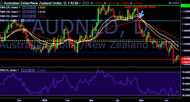 We prefer to take short position in AUD/NZD around 1.0485, stop loss 1.0547 and target 1.0408 levels.