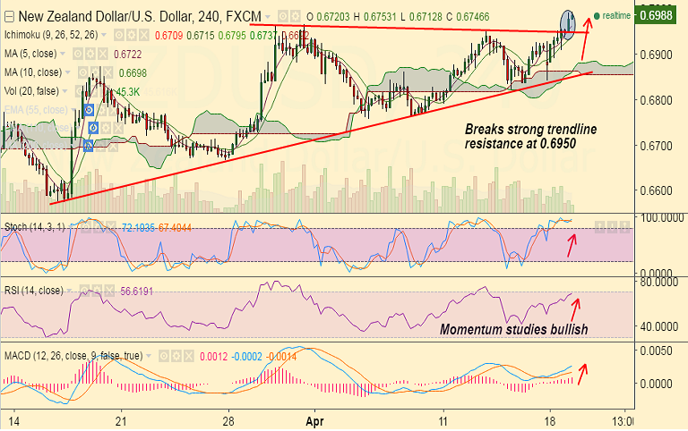 - The pair has broken strong trendline resistance at 0.6950 on the 4-hourly charts and is on track for further gains.