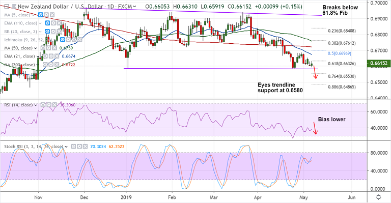 - The pair finds strong trendline support at 0.6580. Break below will see dip till 76.4% Fib at 0.6553.