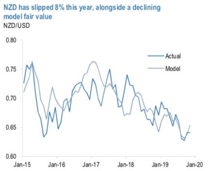 Kiwis dollar peaed upto 0.6755 levels but could not sustain, the pair has closely traced a declining fair value estimate this year, driven by falling local and global rates, weakening business confidence, and softer commodity prices (refer 1st chart). Looking into 2020, we do not expect these fundamental drivers to change much, with two more 25bp cuts forecast from the RBNZ, compared to one for the Fed, leaving rate differentials relatively bounded. NZD raced toward our year-ahead (3Q’20) forecast of 0.62 in late October, but has started to consolidate now after the November RBNZ meeting.