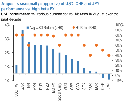 For these reasons, we increase our high beta exposure by layering in a new NZDUSD short in cash to capitalize on both an underwhelming local story along with the defensive risk environment. Meanwhile, the uptick in vol and strong move in the spot has brought our NZDJPY back into the green and remains another core expression of a defensively-oriented portfolio. Ultimately, August looks like it could be a long month between now and the September 1 tariff deadline, which seems liable to keep NZD on the back foot.