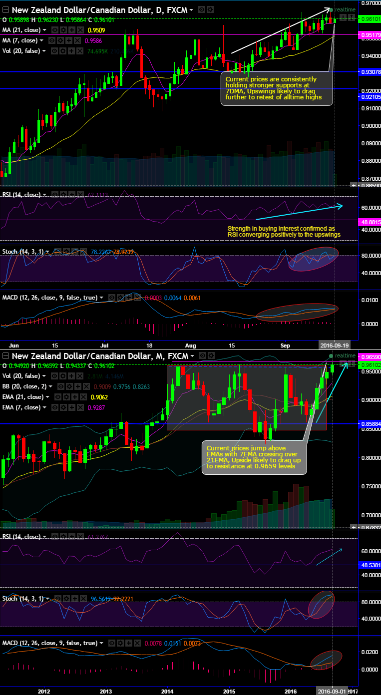 NZDCAD has tested supports at 0.9586 levels (7DMAs) to bounce back after yesterday’s failure swings when it hit all-time highs of 0.9659 levels, bearish pressures were only panicky trades or timely corrections in short term trend as you can make out from the daily charts (every now and then dips are observed in uptrend which is healthy).