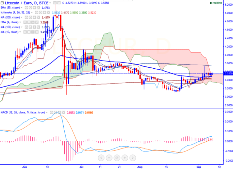 LTC/EUR is seen trading above on Thursday. The pair jumped till 3.5930 levels (BTCE) and is currently trading around 3.59 at the time of writing.