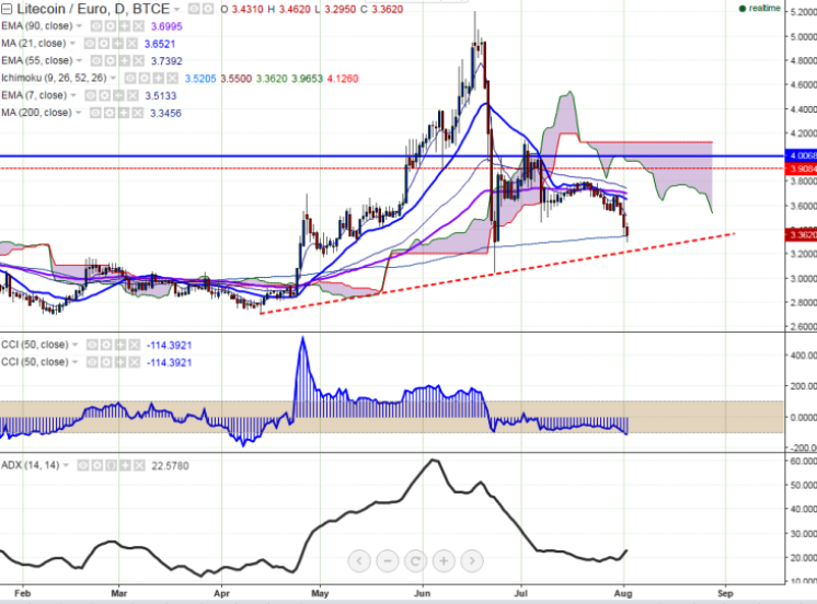 LTC/EUR is seen facing a strong support trading low in red on Tuesday. The pair has broken major support 3.35 and declined till $3.295 levels (BTCE). It is currently trading around 3.36 at the time of writing.