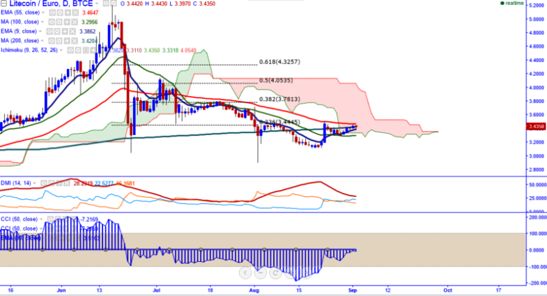 LTC/EUR is seen facing a strong resistance on Friday. The pair has recovered from the low of 3.3970 levels (BTCE). It is currently trading around 3.4300 at the time of writing.