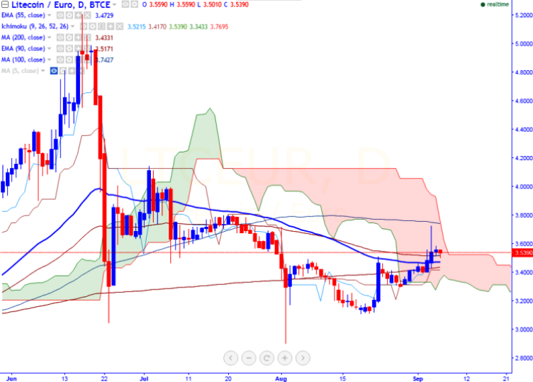 LTC/EUR is seen trading well above on Tuesday. The pair has jumped till 3.725 on Sep 4th 2016 and slightly retreated from that level (BTCE). It is currently trading around 3.54 at the time of writing.