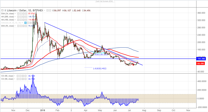 - LTC/USD has declined more than $10 from the high of $94.45 made on Jul 18th 2018. The pair has broken major trend line resistance at $88 and this confirms minor trend reversal and a confirm jump till $103/$117 (100- day MA). The pair declined more than 50% from the temporary top $182.35. It is currently trading around $83.45. It has declined almost 79% from the all-time high of $370.