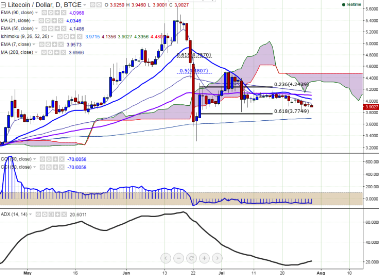 LTC/USD is seen plunging much below on Friday. The pair has slightly retreated after making a high of $3.98 levels (BTCE). It is currently trading around $3.902 at the time of writing.