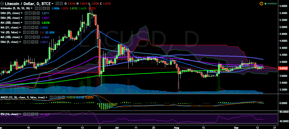 LTC/USD continues to hover around 200-day MA and struggling for a consistent break above this level from past couple of days. It is currently trading at 3.81 levels (BTC-e).
