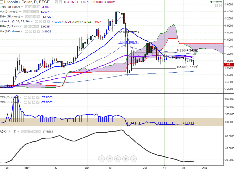LTC/USD is seen plunging well below on Tuesday. The pair has retreated after making a high of $4.0340 (BTCE) yesterday. It is currently trading around $3.92 at the time of writing.