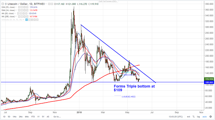 - LTC/USD hits low of $109 and has shown a minor recovery till $123 from that level. It has halted its weakness for a while after continuous selling for four consecutive week. The pair has declined almost 70% from the high of $370. The pair has formed triple bottom around $109 and any break below confirms further weakness. It is currently trading around $112.25. The slight jump in this pair has been using as selling opportunity by traders.