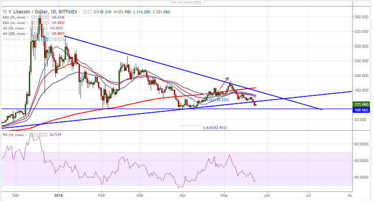 - LTC/USD is continuing its weakness for third consecutive week. The pair has broken major trend line support at 127 after a minor recovery till 140 on May 20th 2018. The pair has declined till 114 and is currently trading around 121. The slight jump in this pair has been using as selling opportunity by traders. The pair has formed major double bottom around 109 and any major weakness only below that level.