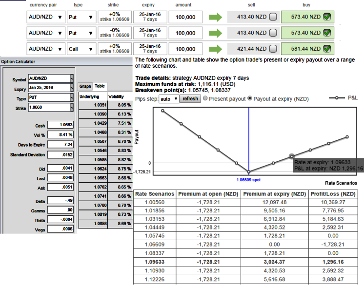Huge profits achievable with the strip strategy when AUDNZD exchange rate makes a strong move either upwards or downwards at expiration, with greater gains to be made with a downward move. From the diagram we can understand how the profitability can be maximized for every shift towards downside and this is not the same on upside.