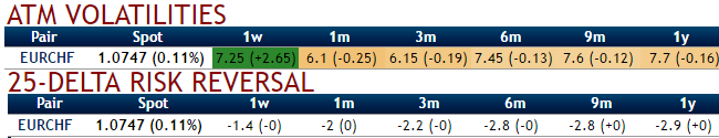 Please be informed that the 1w implied volatilities of EURCHF ATM contracts are rising above 7.25% but have still been the least among G10 currency segment across all expiries.