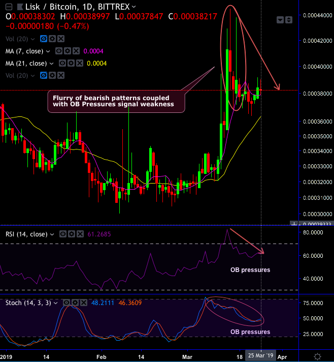 Technically, LSK/BTC has formed flurry of bearish patterns that is coupled with overbought pressures to signal weakness.