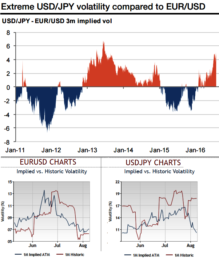 Risk profile: A Further divergence between EUR/USD and USD/JPY volatility, new uncertainties in Japan (BoJ easing in September?) could generate yen turbulence.