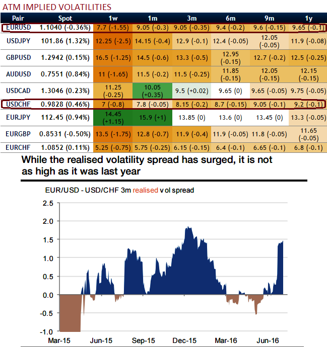 As we expect the vol spread to converge towards a flat level, it is advisable to go long in USD/CHF vs shorts in EUR/USD 3m volatility swaps, indicative bid: receive 0.7 vols.