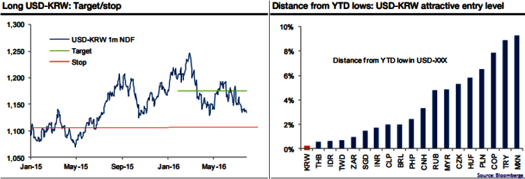 Rationale: Low carry and attractive entry point, long USDKRW as a hedge against adverse August seasonal patterns. August has been a very poor month for EM currencies - falling 1.4% over the past 10 years – with Asia FX depreciating in seven of the last 10 years. This is either due to random events or investors reducing risk during the illiquid part of summer trading (link).