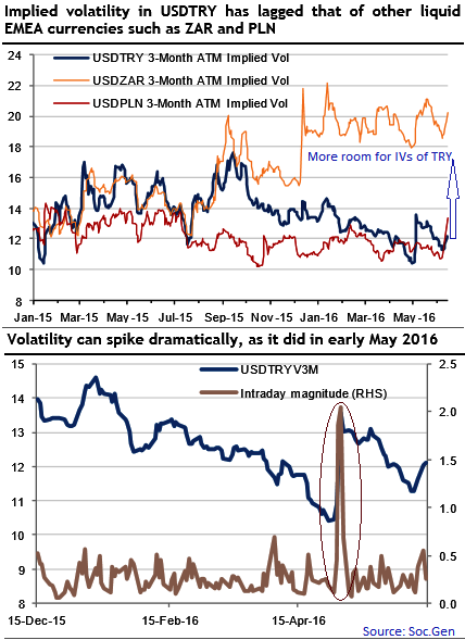A long position on TRY volatility may function as an insurance vehicle against the “Brexit” risk. Notably, as shown in the diagram, volatility in the Turkish lira has lagged behind those of other liquid EMEA currencies such as ZAR and PLN, and we expect that TRY volatility may engage in some catch-up.