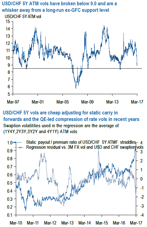 Adjusted for short-dated (3M) FX vol and blended (1Y4Y, 2Y3Y, 3Y2Y, 4Y1Y) USD and CHF swaptions vols, 5Y ATMs look ~1.5 pts. too low (refer above chart).