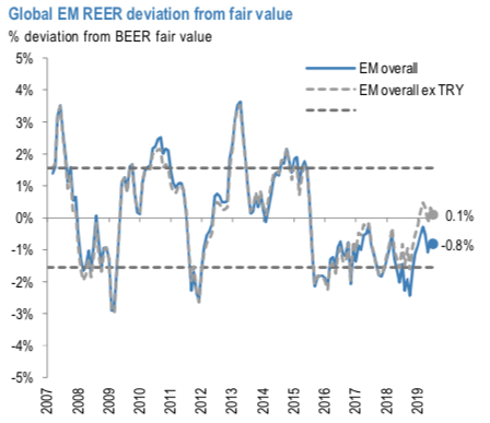 The valuations still appear neutral. Our BEER fair value models put currencies at fair value (refer above chart) and while EM FX positioning shows a small OW according to our client survey, this is not as stretched as positioning in EM sovereign credit and EM local rates which have much larger consensus OWs.