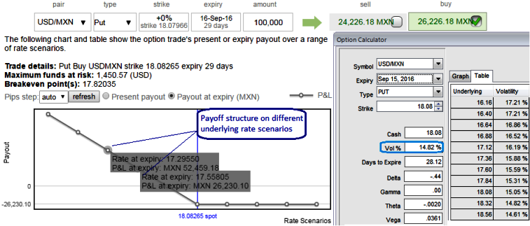 So, as shown in the diagram, this is the option strategy in which the Mexican foreign traders who have their dollar receivable exposures are suggested to buy an at the money put option of 1m tenors while simultaneously buying an equivalent notional amount of the underlying spot FX.