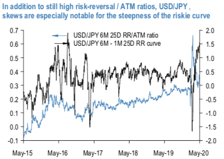 USDJPY is no exception to the general theme of rich risk-reversals relative to ATM vols across G7 surfaces; the Yen skew curve also screens extremely steep. We flagged the elevated RR/ATM ratio set-up last week as a key rationale for initiating a delta-hedged ratio USDJPY put spread to scalp smile theta, a structure that also dovetails with our Yen strategists' view of gradual currency strength in coming months as Japan’s post-COVID-19 return to deflation amid tame BoJ easing relative to the Fed increases JPY’s real yield edge over USD. A related notable observation regarding JPY skews is the extreme steepness of the risk-reversal curve (refer 1st chart), which renders the belly of the curve (6M) a relatively better location for medium-term skew shorts than shorter-expiries, and also has the happy side-effect of providing some insulation against erratic gamma spikes that can never be ruled out in the current virus-infected and politically fraught market environment.
