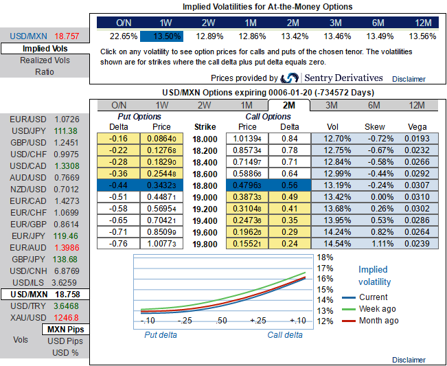The execution: Initiate shorts in 1W (1%) out the money calls with positive theta, simultaneously, buy 2M (1%) in the money 0.51 delta call option. Establish this option strategy if USDMXN spot FX is either foreseen to be in sideways or spike up considerably over the next month but certainly not beyond your upper strikes in short run.