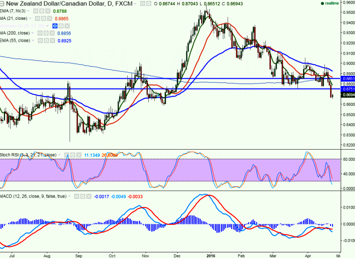 - NZD/CAD has broken major support 0.8750 and declined till 0.8650 .It is currently trading around 0.8690.
