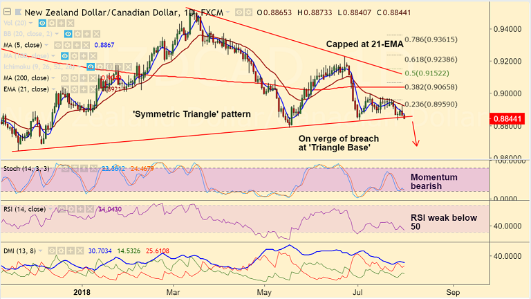 - NZD/CAD has shown a break below Triangle Base support at 0.8855, bias bearish.