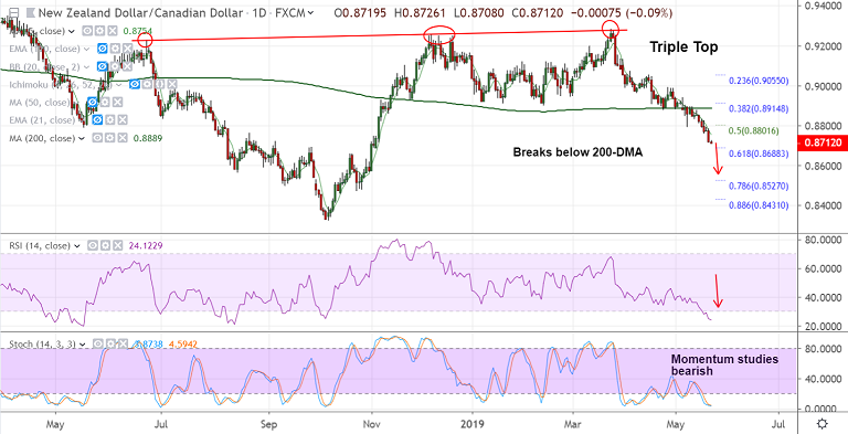 Price action has broken below 200-DMA and is on track to test 61.8% Fib at 0.8688.