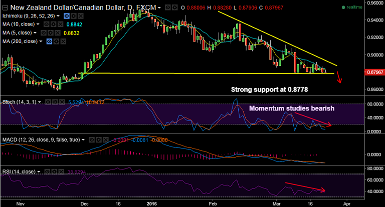 Recommendation: Go short NZD/CAD on break below 0.8775, SL: 0.8850, TP: 0.8715/0.8685/0.8630