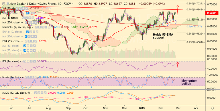 - The pair is holding support at 5-DMA and break below will see weakness til 55-EMA at 0.6776.