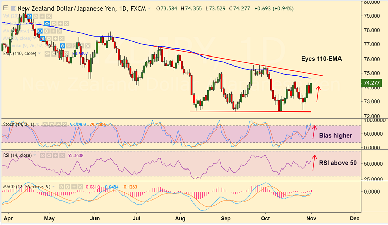 Resistance levels - 74.65 (110-EMA), 75 (trendline), 75.54 (21, 26th Sept)