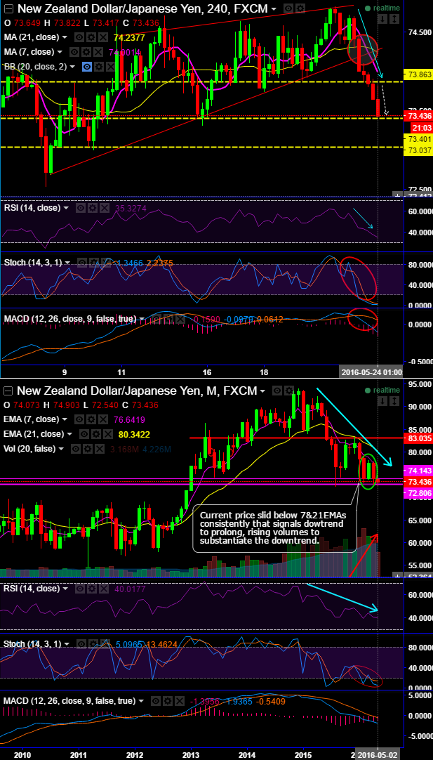 On monthly chart, even though prices have slightly jumped above 74.478 it has remained well below 7EMA, currently it is on the verge of retesting 72.806 sooner or later.
