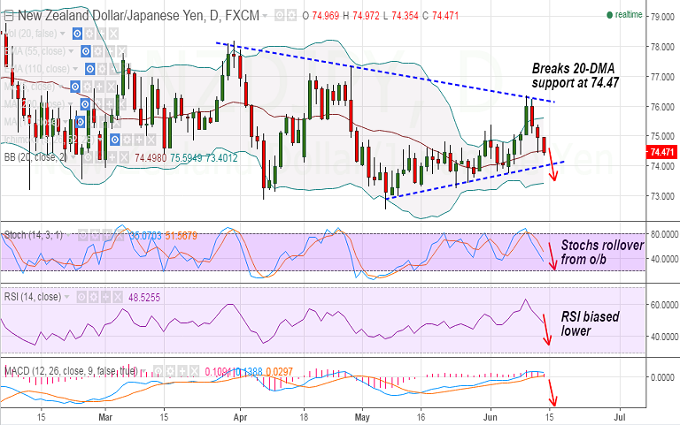 - Techs are biased lower. NZD/JPY has broken 20-DMA support at 74.47 and hit new weekly low of 74.35.