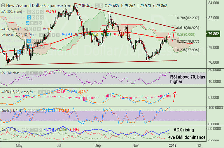- NZD/JPY is extending breakout above 200-DMA on 20th Dec trade, bias higher.