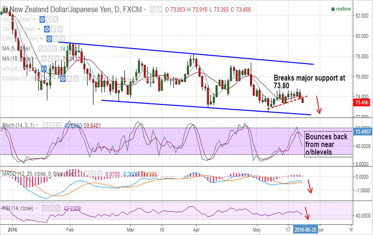 - NZD/JPY extending overnight slump, breaks major support at 73.80, is on track to test channel base support at 72.30.