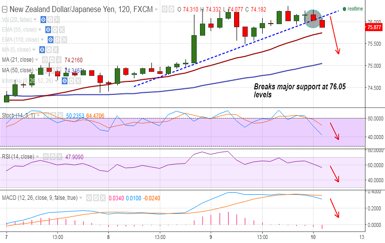 - NZD/JPY is retracing from 7-week high of 76.29 hit on Thursday, has broken below major trendline support at 76.05 on 2H charts.
