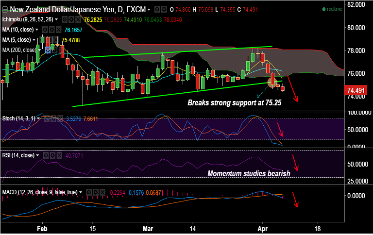 - NZD/JPY has breached strong trendline support at 74.25, we see scope for test of 73.55 levels.