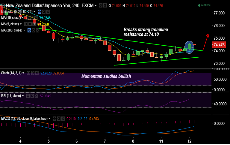 - NZD/JPY has broken above strong trendline resistance at 74.10 and is currently trading around 74.50 levels.