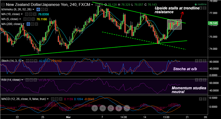 NZD/JPY upside stalls at strong trendline resistance, pair struggling to extend gains above.