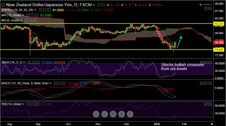 - 74.45 (double bottom - June 2013, Sept 2015) strong support for NZD/JPY, close below could see more weakness, declines till 69.30 then look likely.