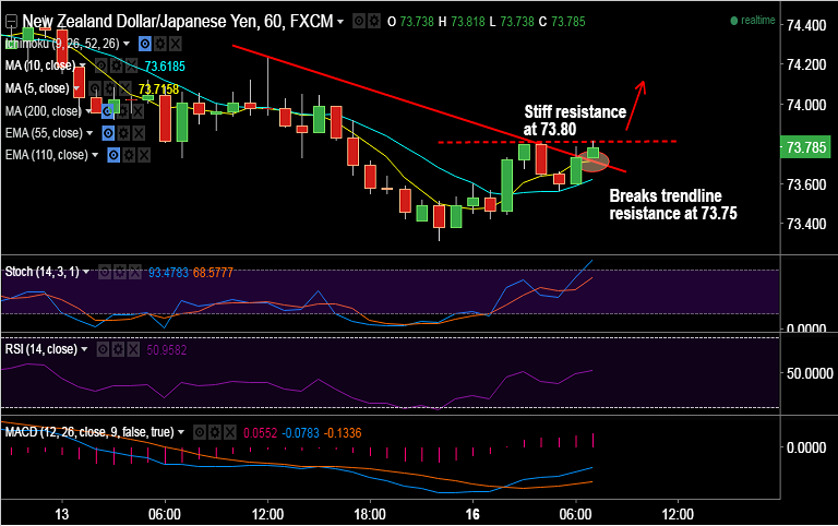 - The pair has broken trendline resistance at 73.75 on the hourly charts, but was rejected at next resistance by 73.80.